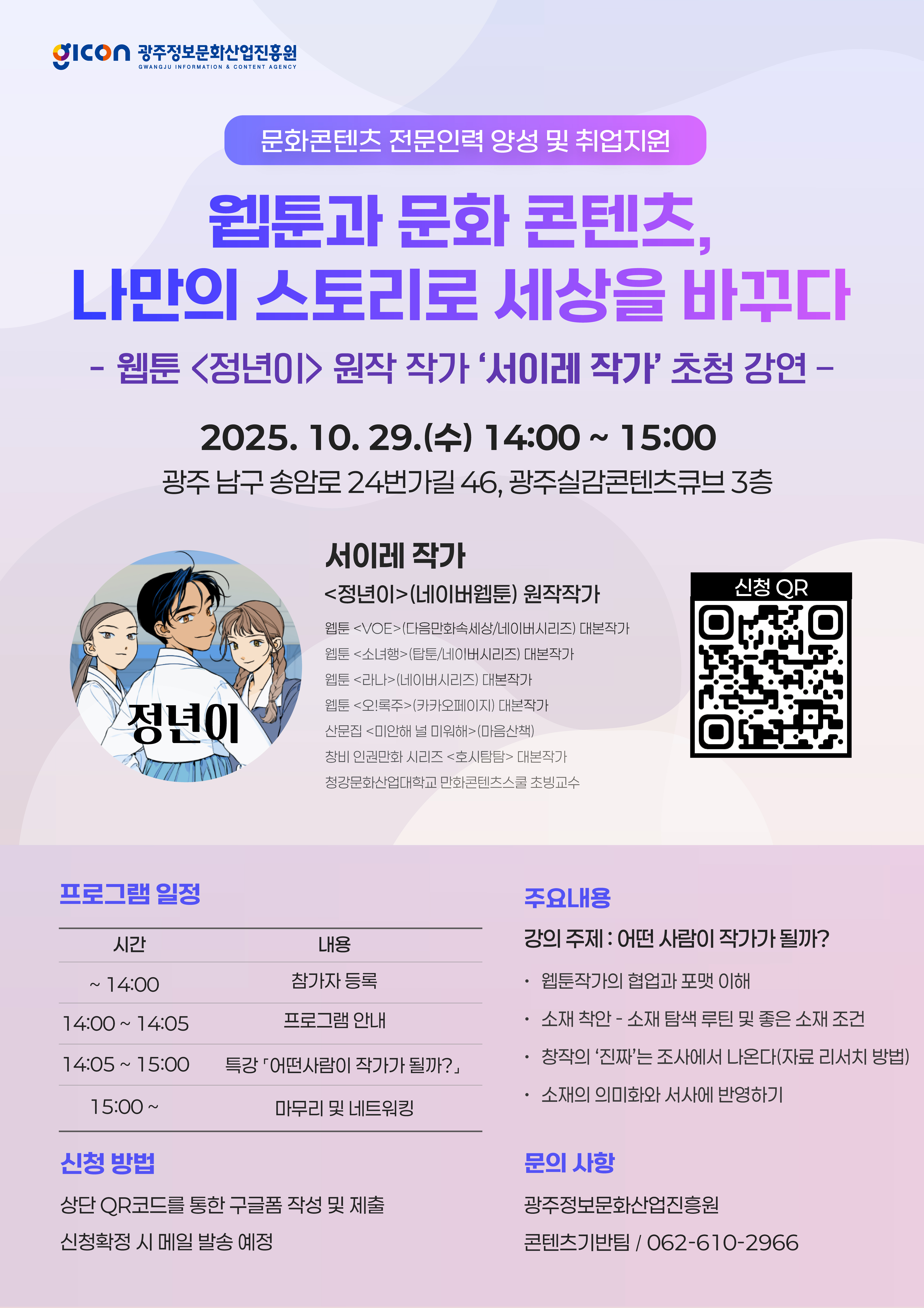 광주정보문화산업진흥원에서 문화콘텐츠 분야 취업을 희망하는 학생들을 위한 「웹툰과 문화 콘텐츠, 나만의 스토리로 세상을 바꾸다」작가 초청 특강을 진행합니다